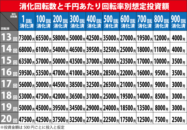 続いては、回転率&遊タイム発動残り回転数別に投資額がいくらくらいになるかを想定した表をチェックしていきましょう。