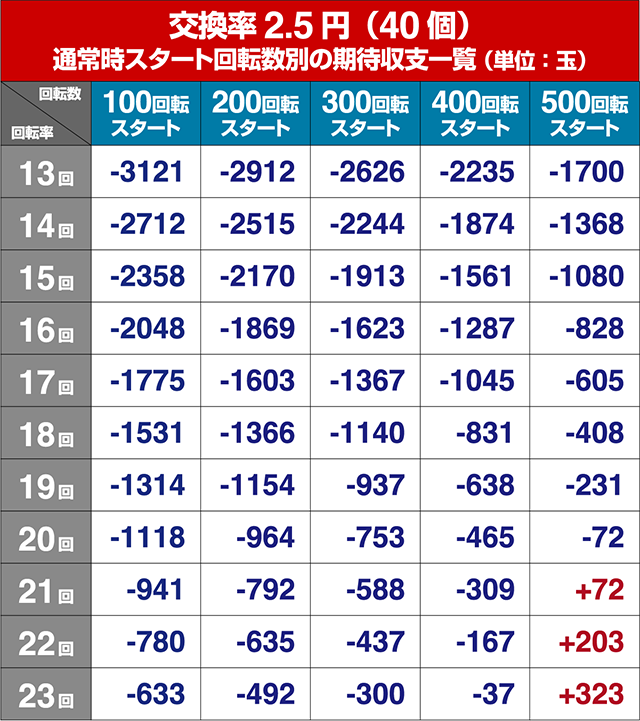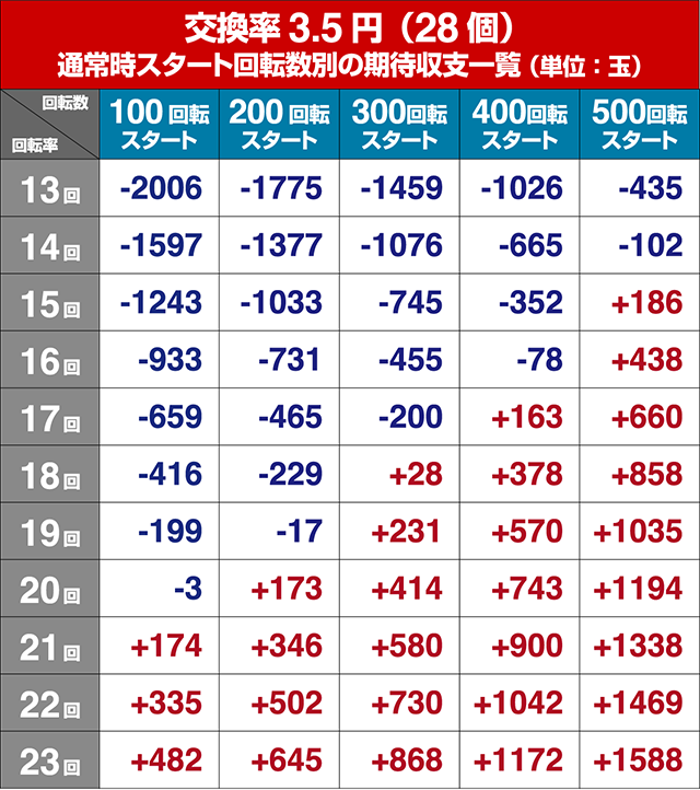 こちらからは、通常時スタート回転数別&交換率別の期待収支一覧表をチェックしていきましょう。
