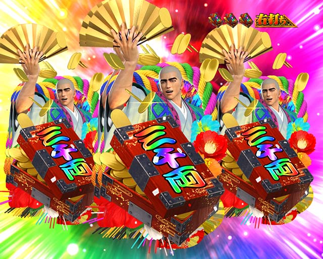 右打ち中にの10R大当り時に三千両図柄が表示されると「超傾奇御免BONUS」で10Rの保留内連チャンが濃厚。三千両図柄はシリーズ初搭載となりますね~。