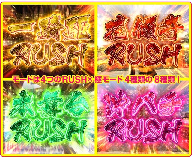 今作のST中はシリーズお馴染みの一騎駆RUSHに加え、新たに花傾奇RUSH、本舞台RUSH、沖パチRUSHの演出モードを搭載。各モードには極モードもあるので、全8種類から好きなモードを選択可能となります。