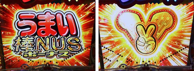 うまい棒NUS図柄停止で大当り。一旦停止する図柄で信頼度変化。その他、ボタンPUSHによるチャンスアップも存在。