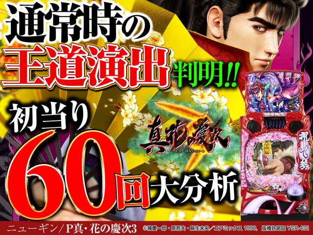 「真・花の慶次」シリーズの最終章にして最新作『P真・花の慶次3』が待望のホールデビューを果たした。ST継続率は83.3%(残り保留4個含む)、右打ち時の8割が出玉約1500個(払い出し)というスペックは、まさに慶次らしい破壊力抜群の性能だ。