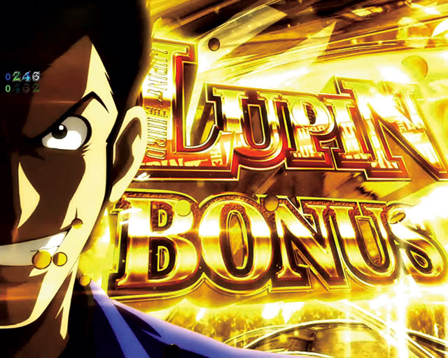 偶数図柄揃い時はLUPIN BONUS(3R or 10R)に突入。大当り消化中に発生する昇格演出で、ボタンを押してタイプライタ予告が発生すればPERFECT BONUS(10R)に昇格しますよ~!