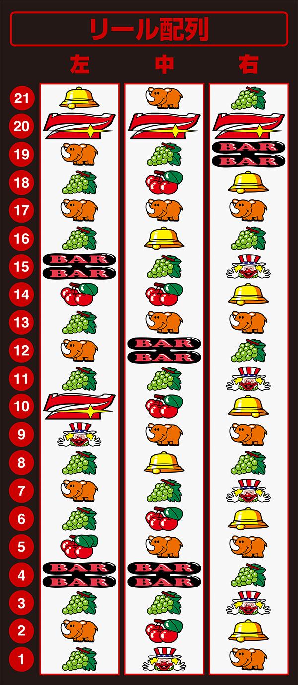 打ち方の説明の前にまずは本機の配列を確認しておこう。取りこぼしの発生する小役はチェリー、ベル、ピエロの3役。ブドウはフリー打ちしても必ず揃う小役となっている。