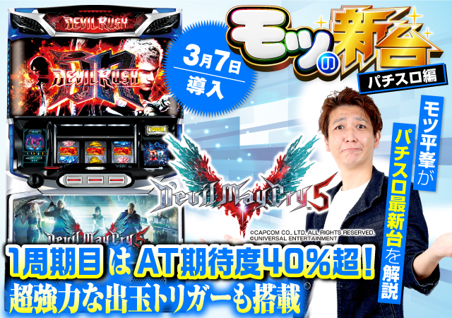 通常時&AT中ともにレア役と3役(Vベル・ダンテ目・リプレイ)が鍵を握る『パチスロ デビル メイ クライ 5』は3月7日より全国のホールに順次導入予定。