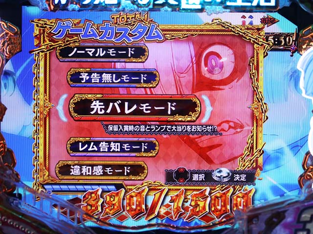 本機はメニュー画面から演出カスタマイズが可能、先読み高期待モードにカスタムした場合、保留変化を始めとした先読み予告の信頼度が軒並みアップする。先読みの発生によりドキドキしたいプレイヤーはカスタムするのも一興だ。