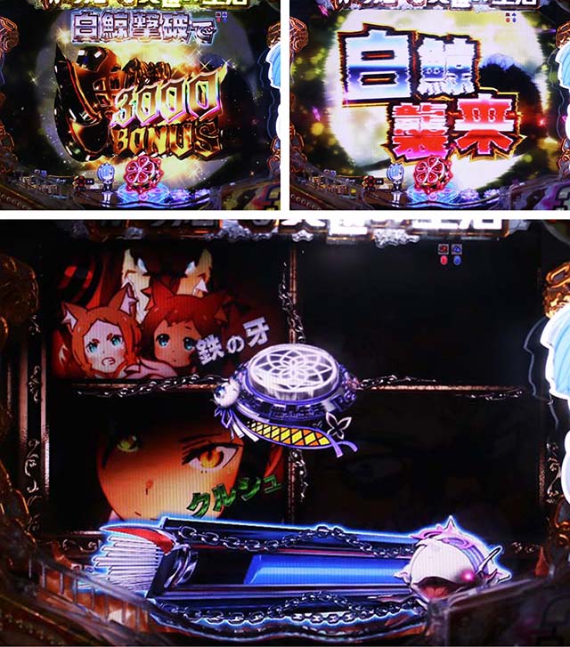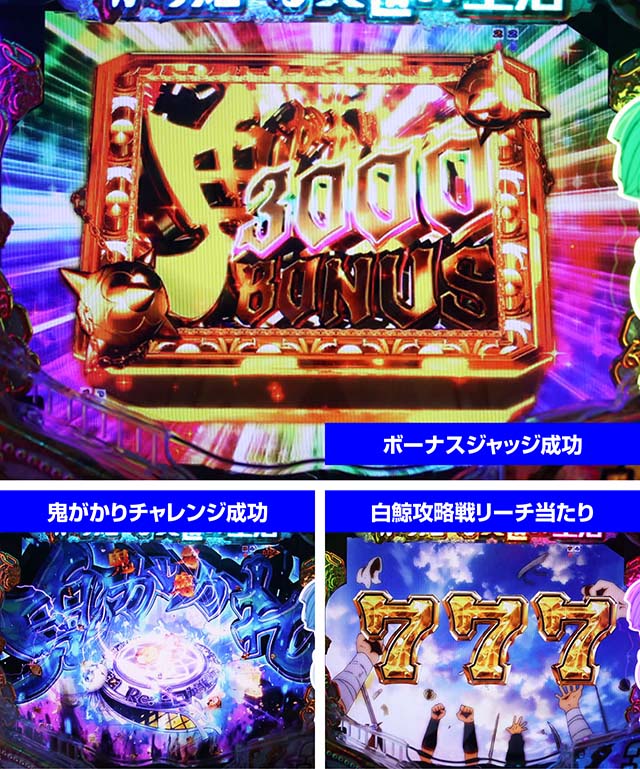 どんなパターンであれ白鯨討伐で「鬼がかり3000BONUS」濃厚となる白鯨攻略戦リーチだが、大当り濃厚となる組み合わせは多岐にわたる。上記以外にも、キャラ選択ルーレット中にOKボタンを押して選択できれば大当り濃厚などの裏ボタンもある。