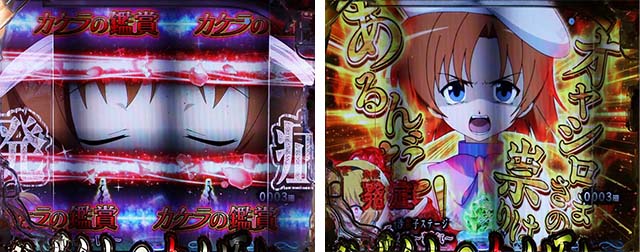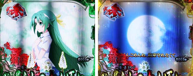 シリーズを継承した大チャンス予告。画面左下表示の雛見沢症候群Lv5到達で発生し、キャラクターリーチ〈後編〉or運命分岐リーチ・解or罪滅しリーチのいずれかに進む。