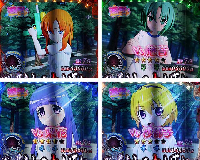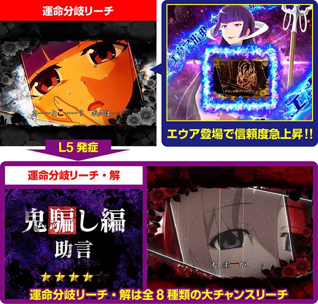 大当りにはL5発症が必須で、その場合は後編or罪滅ぼしリーチに発展する。また、ハズレ後にはシュレディンガーチャレンジやストーリー発展の可能性も。さらに、梨花の後編は他より抜けたアツさを誇る。