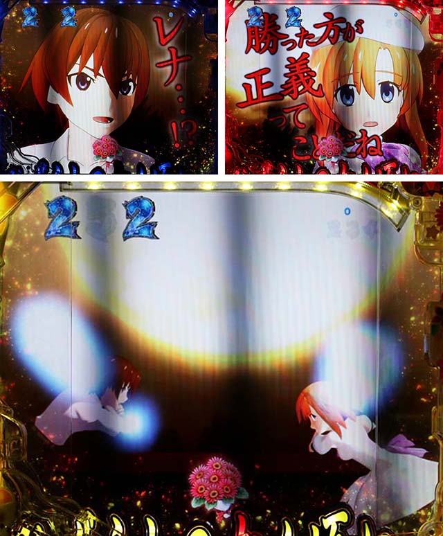 大当り濃厚パターンを除いた本機最強リーチ。3DCGで圭一とレナのバトルが展開。