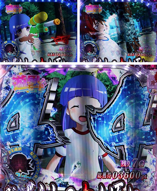 水鉄砲を圭一が回避すればスーパーリーチ発展。水鉄砲を構える際の背景に赤アイテム出現で発展濃厚。