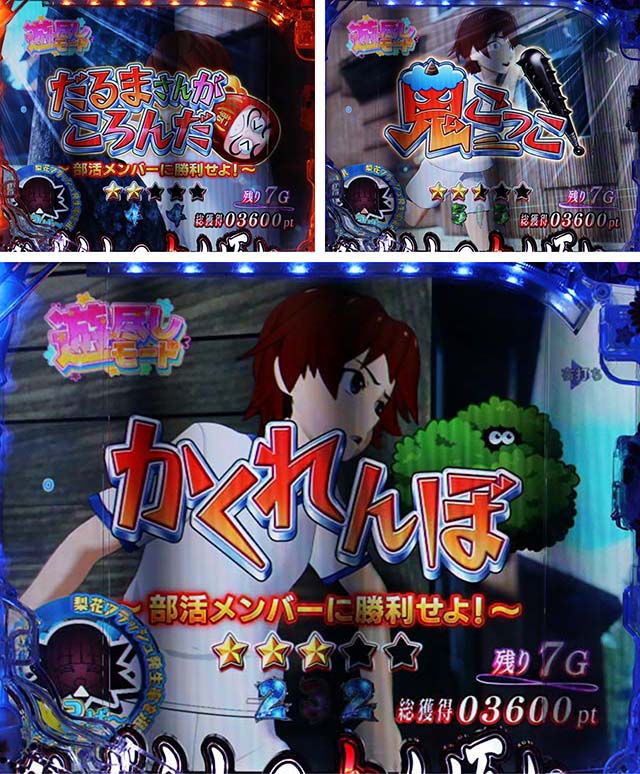 ST14回転のうち中盤8回転となるモードその2。レナの追撃から逃れると大当り。校舎外・内、さらに場所で信頼度が変化し、固有アイテムやボタンが赤なら激アツ。