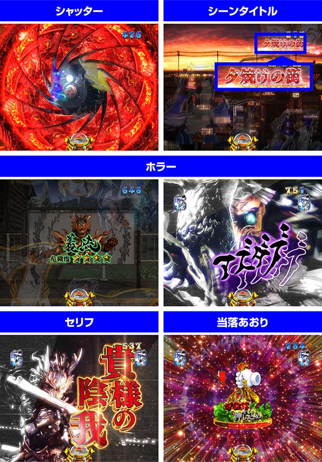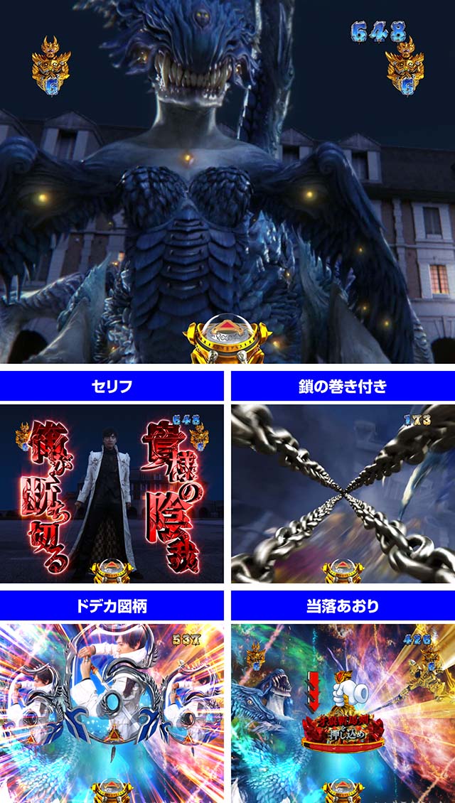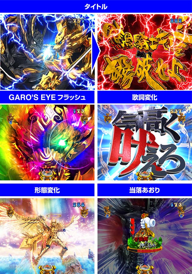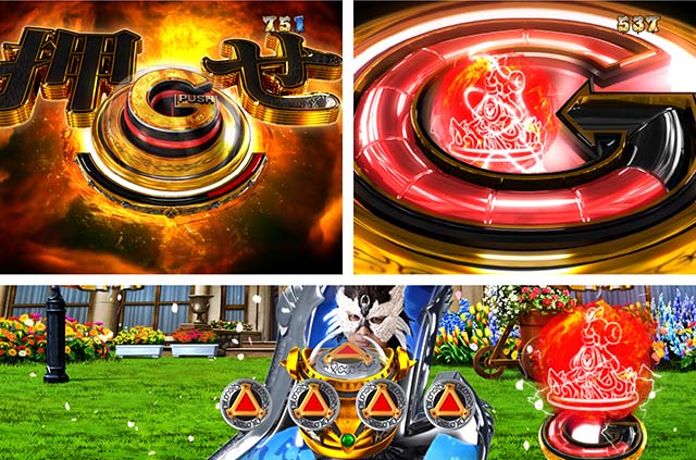 色変化・赤や、牙狼剣保留2種類、絆保留、GARO保留とおなじみ&本機ならではの高信頼度保留が複数。なお逆エンブレムによる超チャンスパターンも踏襲、こちらは魔戒CHANCE突入濃厚。ボタン保留はPUSH後の変化に注目だ。