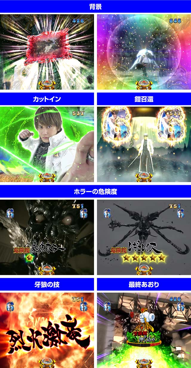 保留変化は牙狼シリーズ伝統の激アツパターンを継承、その他筐体上部ギミックでも展開するパターンも存在。