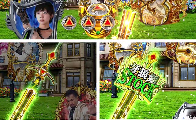 鞘保留が出現し、その後に飛来する牙狼剣が鞘に収まれば半数以上が大当りに。スーパーリーチ中までストックされた場合は最終当落で牙狼剣ギミックが発動。鞘保留のみではリーチにならないガセもあるので要注意。