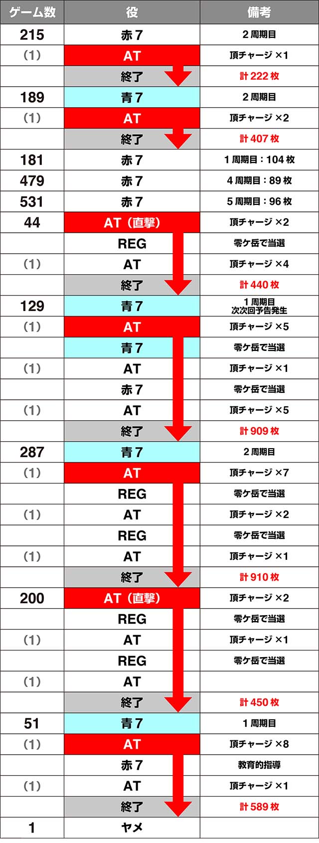 AT直撃確率はご覧の通り。設定1と6では4倍以上の差があり、序盤から複数回の直撃があれば高設定の期待が高まる。