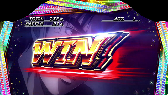 レジェンドバトルの勝利画面(WIN表示)でサブ液晶をタッチするとサブ液晶の色が変化して設定を示唆。画面と示唆内容はAT終了画面のサブ液晶タッチと共通だ。