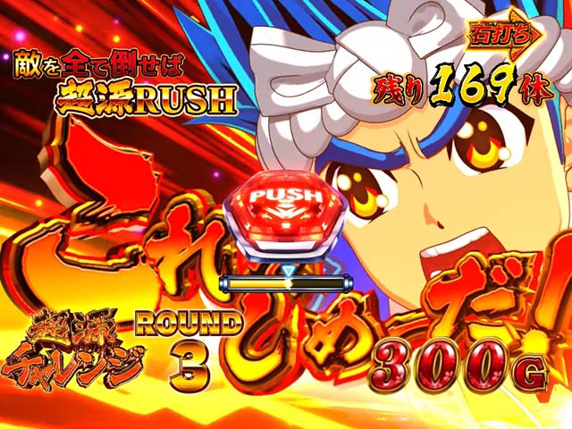 3・7以外の図柄が揃った初当りラウンドでは、超源RUSH突入を賭けたチャレンジ演出が発生。バトルor完全の2種類から告知タイプを選択可能。