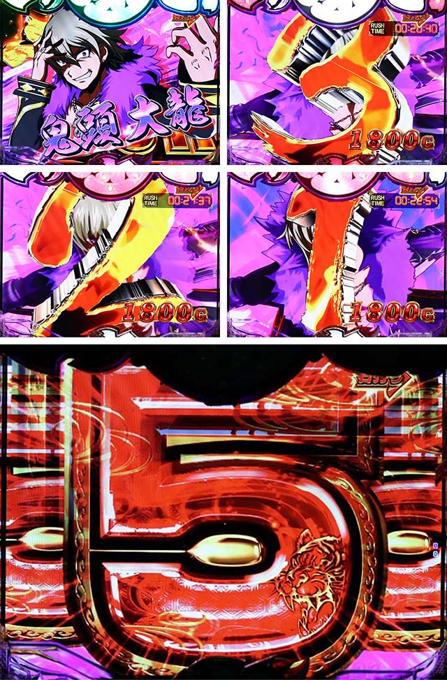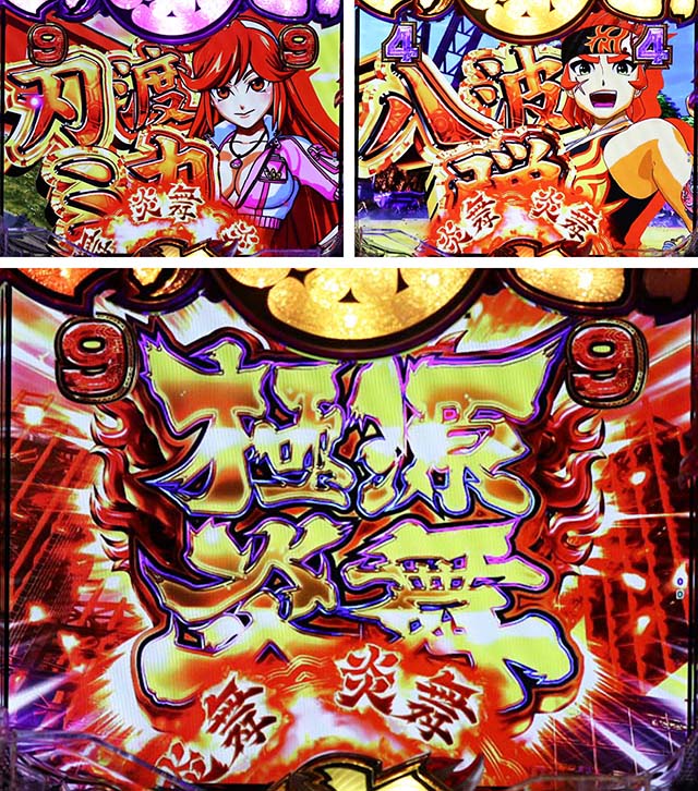 当段階での大当りよりも連続予告や極源炎舞予告に繋がるのが重要となるリーチ。3種類のキャラそれぞれに固有チャンスアップが存在し、共通チャンスアップは源さんカットイン・終盤カットインの2つとなる。