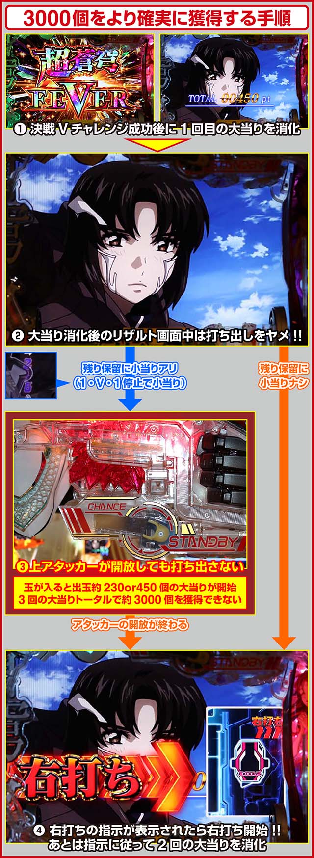 より確実に約3000個を獲得する手順は簡単で、液晶の右打ち指示が表示されたときに打ち出すのみ。1回目の大当り終了後は、たとえ上アタッカーが開放していても指示がなければ打たなくてOKとなるので、初当り時にヘソ保留が残っている場合はうっかり打ち出さないように注意しましょう!