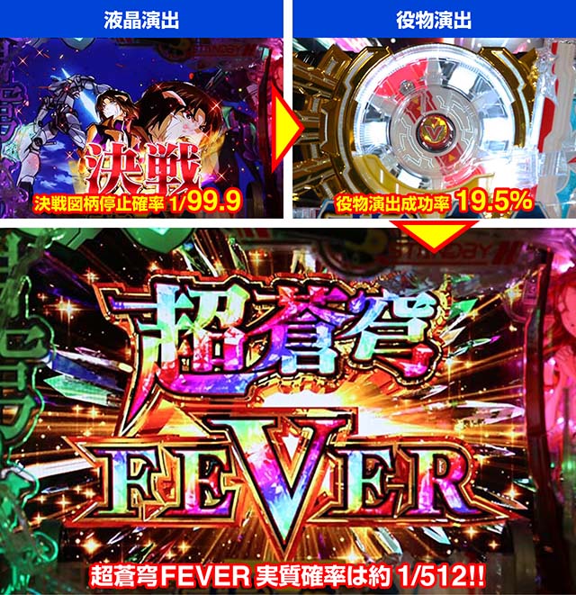 通常時はまず約1/99.9で出現する「決戦図柄」停止から、役物演出の「決戦Vチャレンジ」を目指します。決戦Vチャレンジ中はV穴に玉が入賞すると約3000個獲得できる「超蒼穹FEVER(8R+10R×2回)」へ。リミット(大当り3回)到達後は、残保留1個の引き戻し抽選ゾーン『蒼穹作戦』が発動します。
