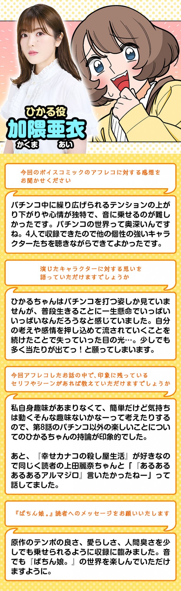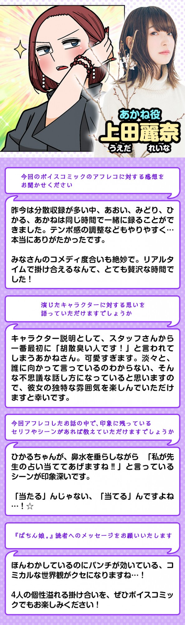 そして今回、『ぱちん娘。』初期メンバーの残り2人、ひかるとあかねの登場回もボイスコミック化されることになったんです。ついに吹き込まれるんですよ、魂が!