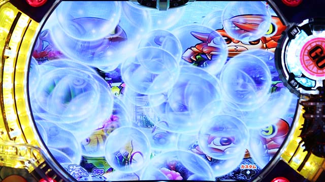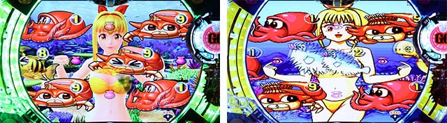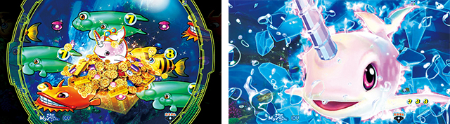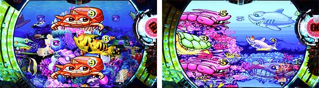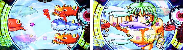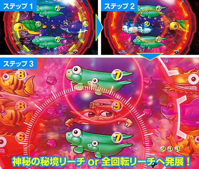 大当りの際は全て金図柄揃いとなるリーチ。トータルで半数強が大当りとなるが、発展後のボタンPUSHで出現するのが魚群か泡かで信頼度が激変。前者なら信頼度9割超と上位モード継続目前!