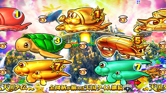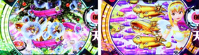 スーパーリーチ発展時、レッドカーペットに天使姿のマリンちゃんが登場すれば奇数テンパイが金図柄テンパイに変化&半数強が大当りに。さらに天使群付きなら金図柄揃い濃厚!