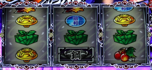 超番長の突入契機は2種類。フリーズと強弁当箱となるが、強弁当は上記出目をご覧の通り、左リールBAR狙いをした際に中段までスベってきて一直線に揃う形となっている。