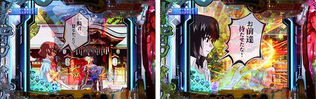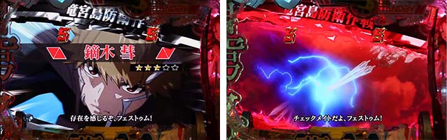 3種類のキャラに応じたアクションが展開。キャラが誰かよりもリーチ中のチャンスアップの方が重要度は高く、赤パターン発生に期待したい。また小当り獲得=決戦図柄が停止した際に、総士参戦が発生すると連撃ルート以上が濃厚となる。