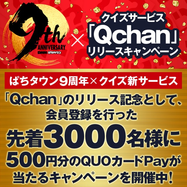 キャンペーンがもう1つ。オンラインでクイズが楽しめる新サービス「Qchan」を使った、9周年特別キャンペーンを実施します。なんと、クイズに参加するだけでApple製品など総額100万円相当の賞品が当たる可能性があるんですよ!