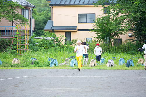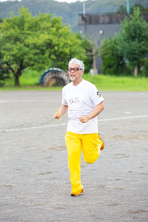 美しいフォーム。モモがめちゃくちゃ上がっています。ヤングさんだということを一旦忘れてみてください。白髪の男性が小雨降る中、こんなに全力疾走する場面はそうそう見られるものじゃないですよ。