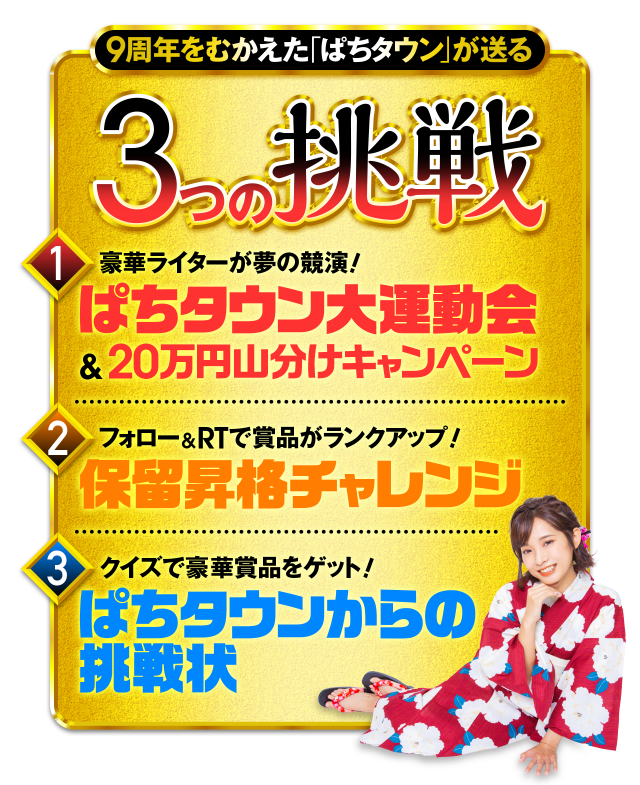 コンテンツ概要はこのページで、詳細は専用ページでチェックできます。ゆずっきー(@yu_zukizuki)の浴衣姿と一緒に、9周年特別企画としてぱちタウンが送る「3つの挑戦」をお楽しみください!