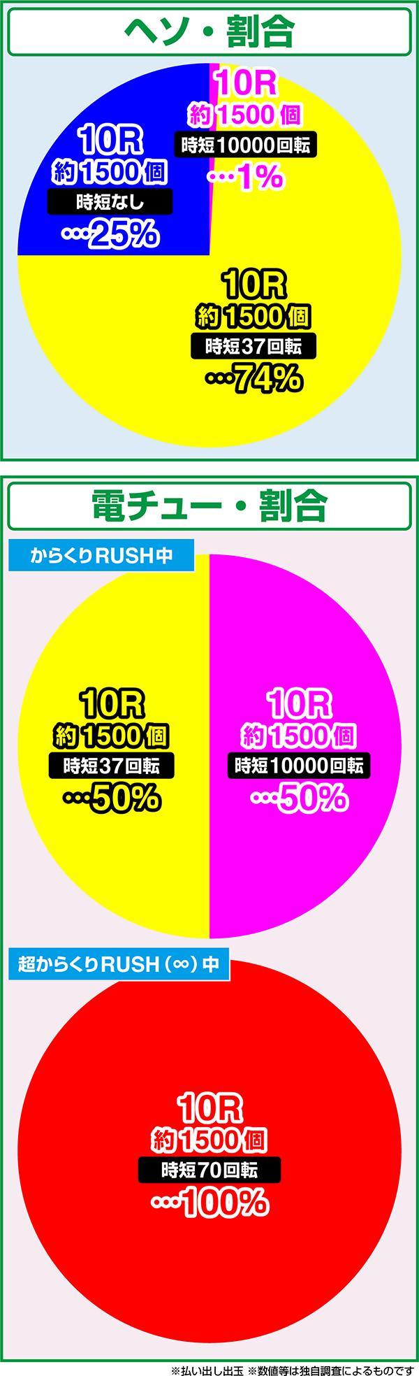 残りの3/4で突入する、時短37回転+残保留4個の「からくりRUSH」は継続率約60%、時短70回転+残保留4個の「超からくりRUSH」は継続率約81%。電サポ中もALL1500個なので、早めにまとまった持ち玉勝負ができそうなのも嬉しいところです。