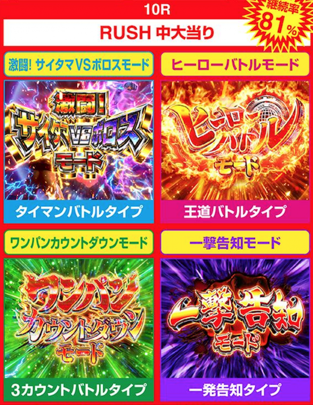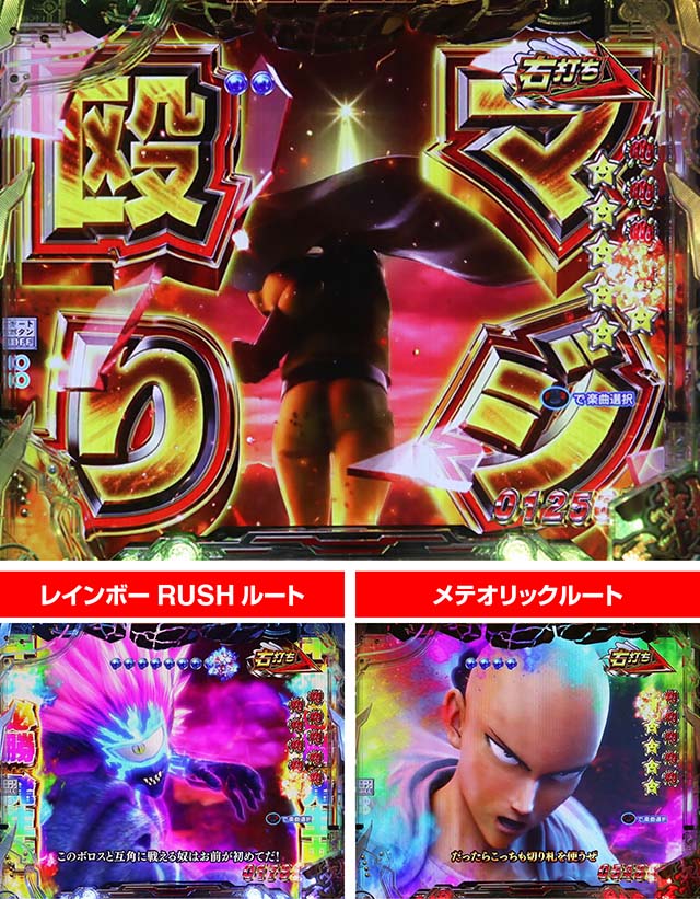 サイタマとボロスのタイマン対決で、サイタマが勝利すればRUSH継続濃厚! バトル中の注目ポイントは「タイトル画面」「先制分岐演出」「パワー貯め演出」「岩ボタン連打演出」など多岐にわたります。
