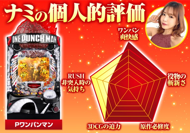 以上が『Pワンパンマン』の見どころや注目ポイントでした。今回も主観要素強めですが、ナミ的レーダーチャートを5項目に分けて評価してみました!