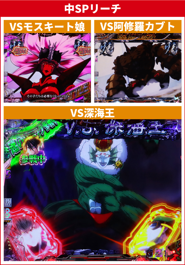 中SPリーチは全3種類で、最も多く出現したのがVS阿修羅カブトだ。VS深海王は5回と一番出現回数が少ないが、実戦上のRUSH突入率は80%でトップだ。