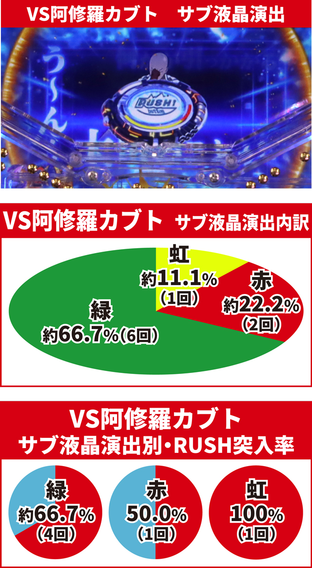 VS阿修羅カブトもサブ液晶がポイントで、ボタンを押した後の背景の色で期待度が変化する。一番多く出現したのは緑で、虹も1回出現した。