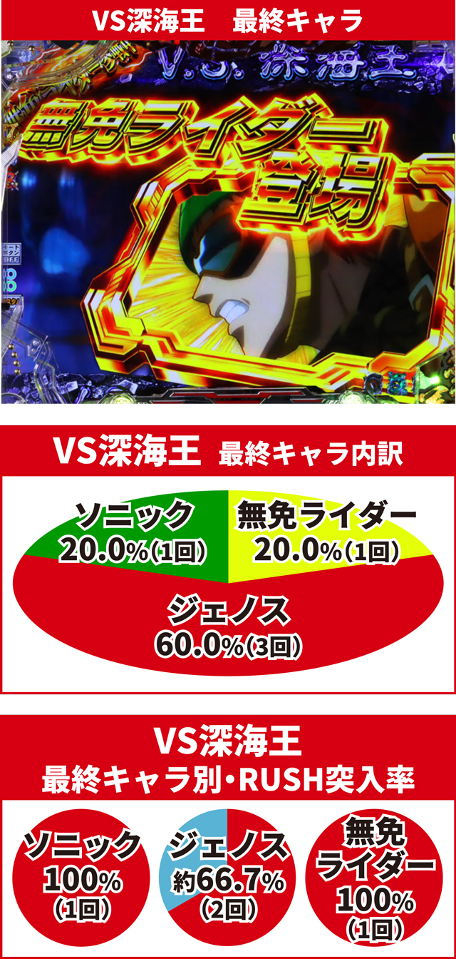 VS深海王のポイントは出現ヒーローで、最後に登場したキャラで期待度が変化。最も多く出現したのはジェノス(赤)で、ソニック(緑)と無免ライダー(金)はいずれも1回出現し、実戦上のRUSH突入率も100%だった。
