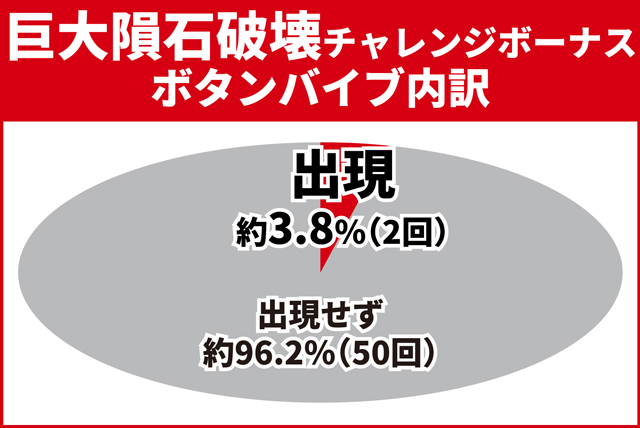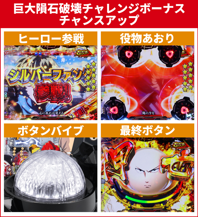 0or7以外の図柄揃い時に発生するのが巨大隕石破壊チャレンジボーナスで、主なチャンスアップはヒーロー参戦、役物あおり、ボタンバイブ、最終ボタンの4つ。最も多く出現したのはヒーロー参戦で、メタルナイトが9回と最多。シルバーファングは2回出現し、いずれもRUSH突入となった。