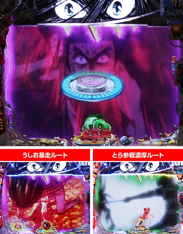 ちなみに末尾が7揃いや、カットインがうしおorとらなら、RUSH終了のピンチから一転。上位RUSHへ飛び級となるため、これ以上の幸福はないだろう。