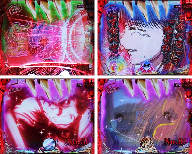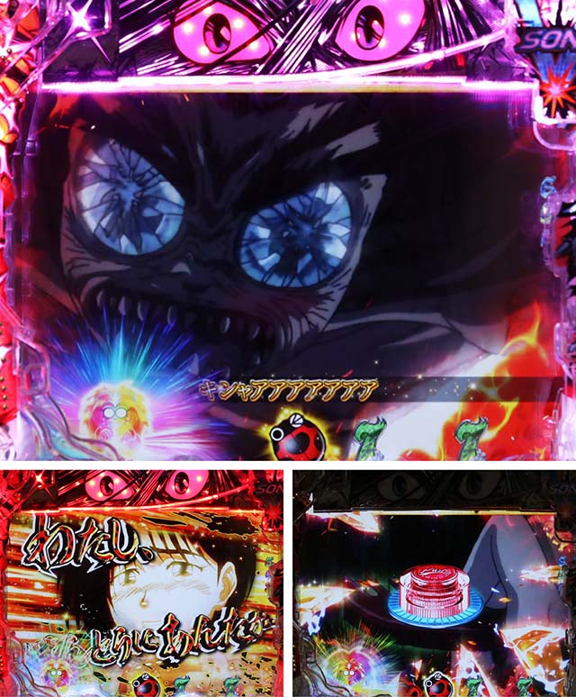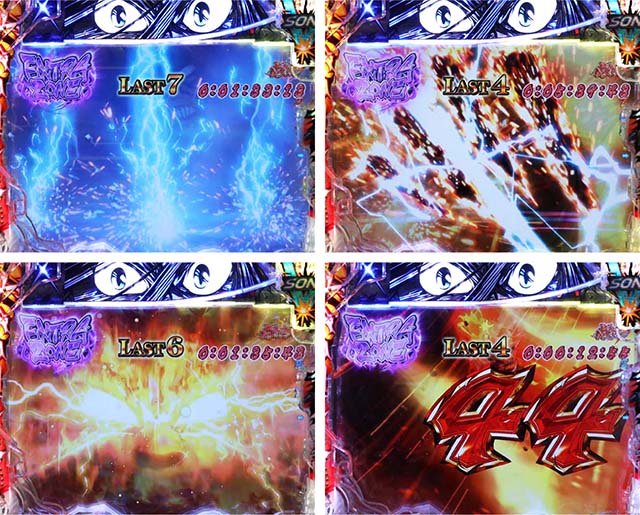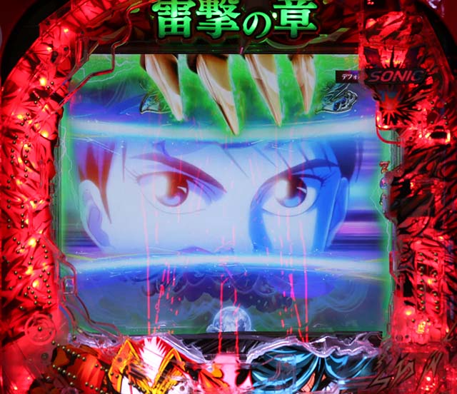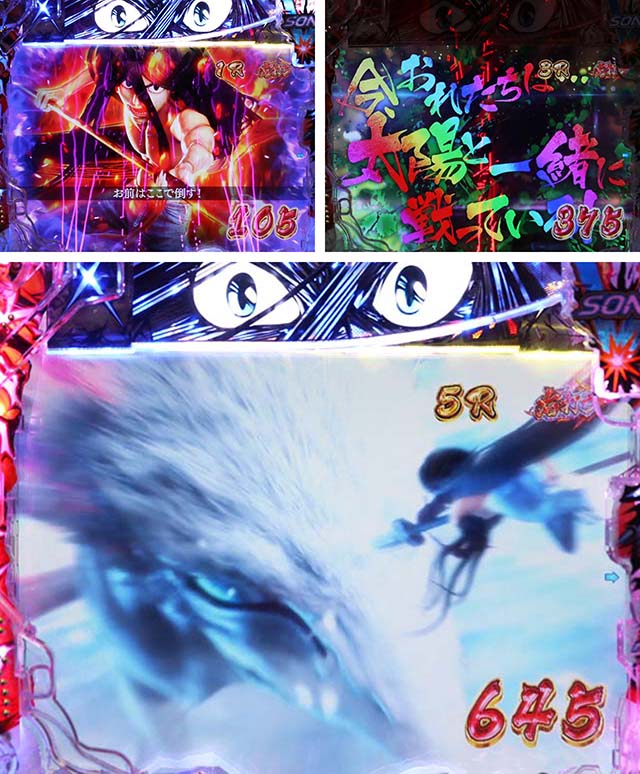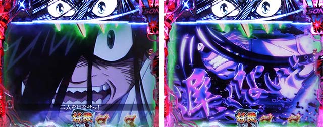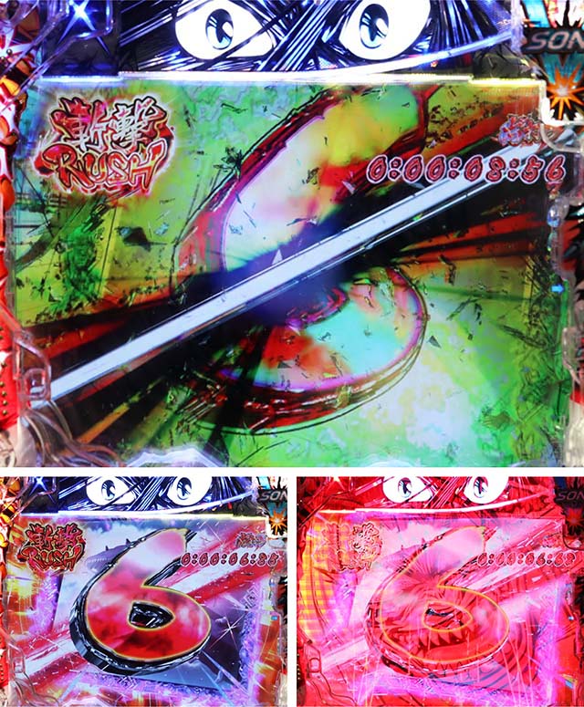 注目は変動開始時のエフェクトや斬撃の大きさで、青系以外ならチャンスアップとなる。図柄の停止順にも特徴があり、デフォルトの左から停止より右から停止がアツい。