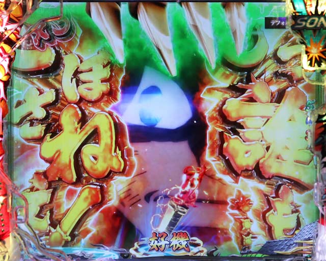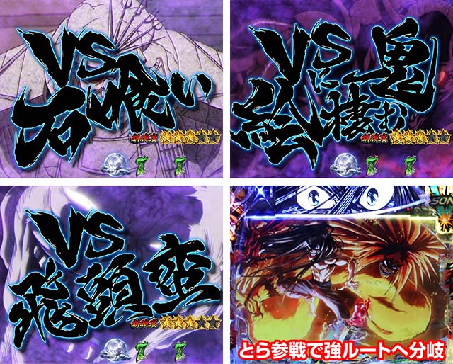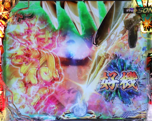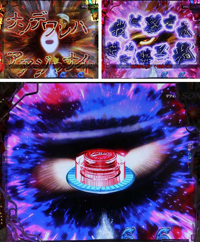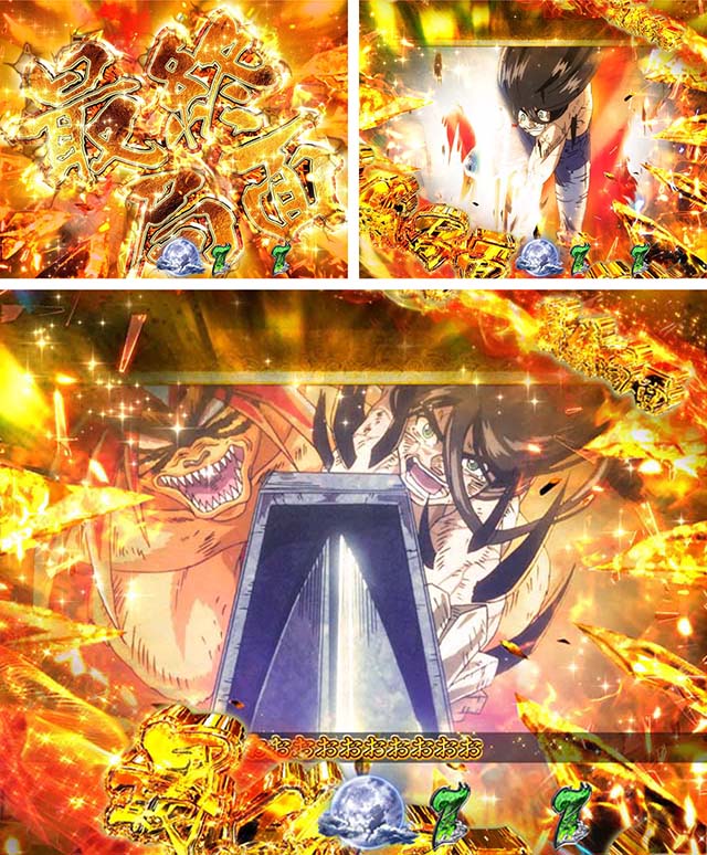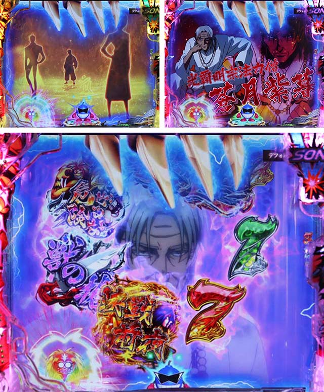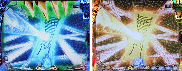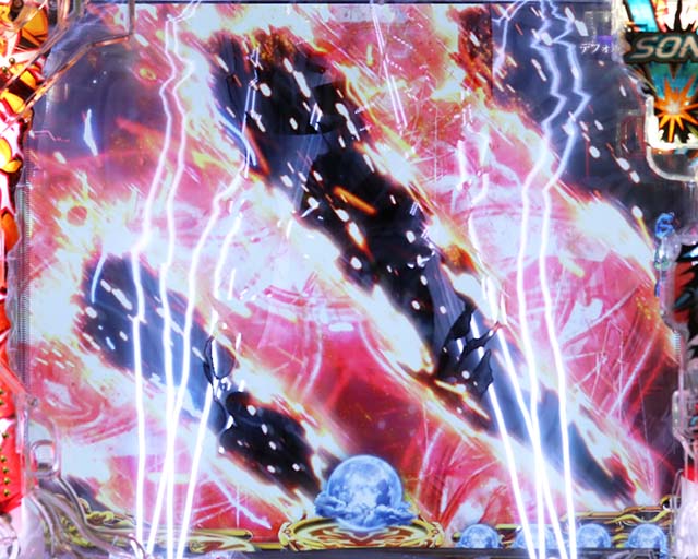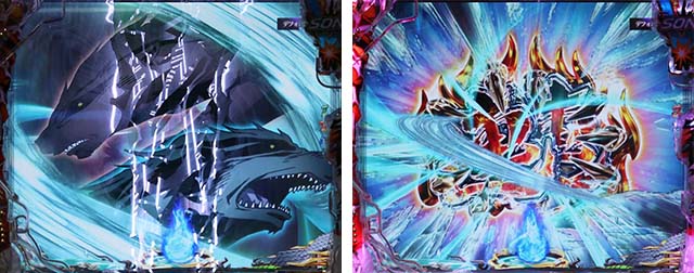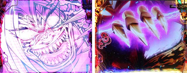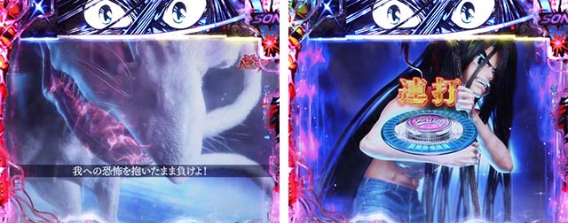 斬撃RUSH同様に、時短終了後は白面の者とのバトルが展開。最終的に攻撃を耐えきれば大当りとなるが、ボタンバイブや金系演出など、超激アツパターンに期待したい。ここでの大当りは下位RUSHと同じ振り分けとなるため注意。