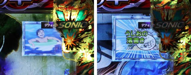 時短終了後の残り保留内で展開される演出で、時間内にうしおが目覚めたら大当り。普段アップになる扉がそのままの画面だったり、空から後光がさしたりと違和感は全て大当り濃厚だ。こちらにも「超白熱BONUS 3000」濃厚となる演出が用意されている。