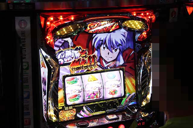 パチスロコーナーの中心にある円形のシマに配置されているのは、大注目機種の『パチスロ犬夜叉』!