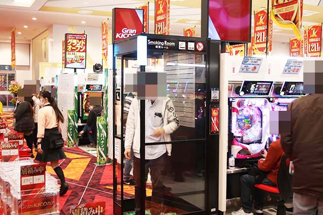 パチンココーナーの中央通路には1人専用の喫煙ルームが用意されている。