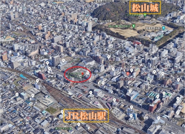 JR松山駅からキスケBOXのロケーション。後方には松山城が見える