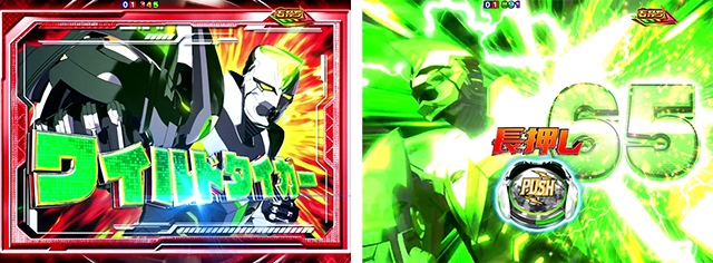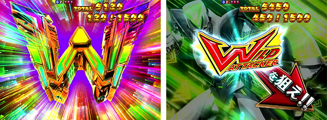 V入賞時にVがWになれば保留内が大チャンス! 10R×2回以上の大当りを獲得できる、文字通りワイルドなチャージ演出。
