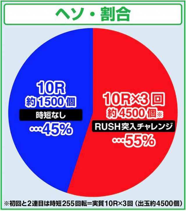 初当りで55%を引けなくても、1500個もらえる安心感も◎ 。RUSH突入成功率は約45.5%と、決して高くはないのでこの評価になりました。実際に打ってみて、どう感じるかで評価が変わりそうです。