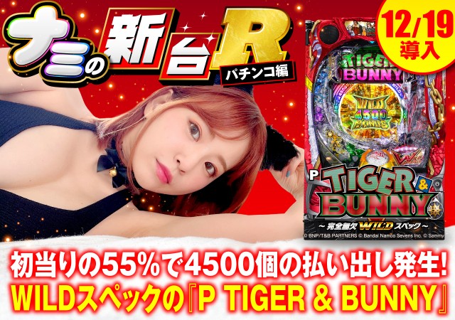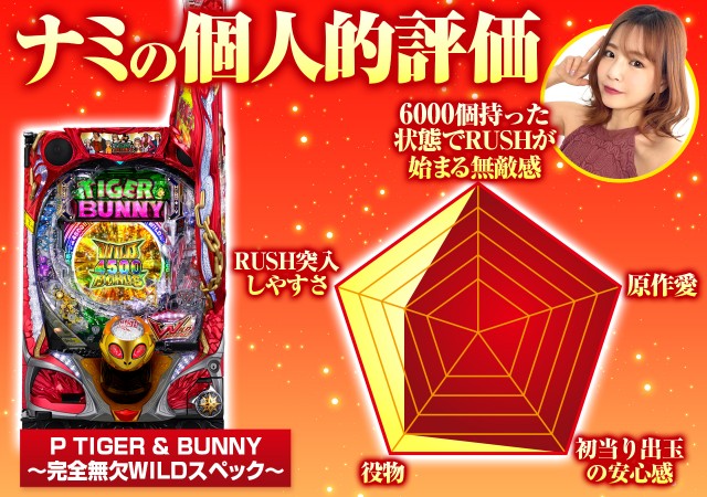 初当りの55%を占める「WILD BONUS」は、約4500個(10R×3回)の出玉を獲得できます! その後の「RUSH突入チャレンジ」(残保留2回転)に成功すれば、継続率約81%の「TIGER & BUNNY RUSH」(時短4回転+残保留2回転)に突入。45%の通常大当りを引いた場合も約1500個の出玉を獲得できるのは安心ですね。